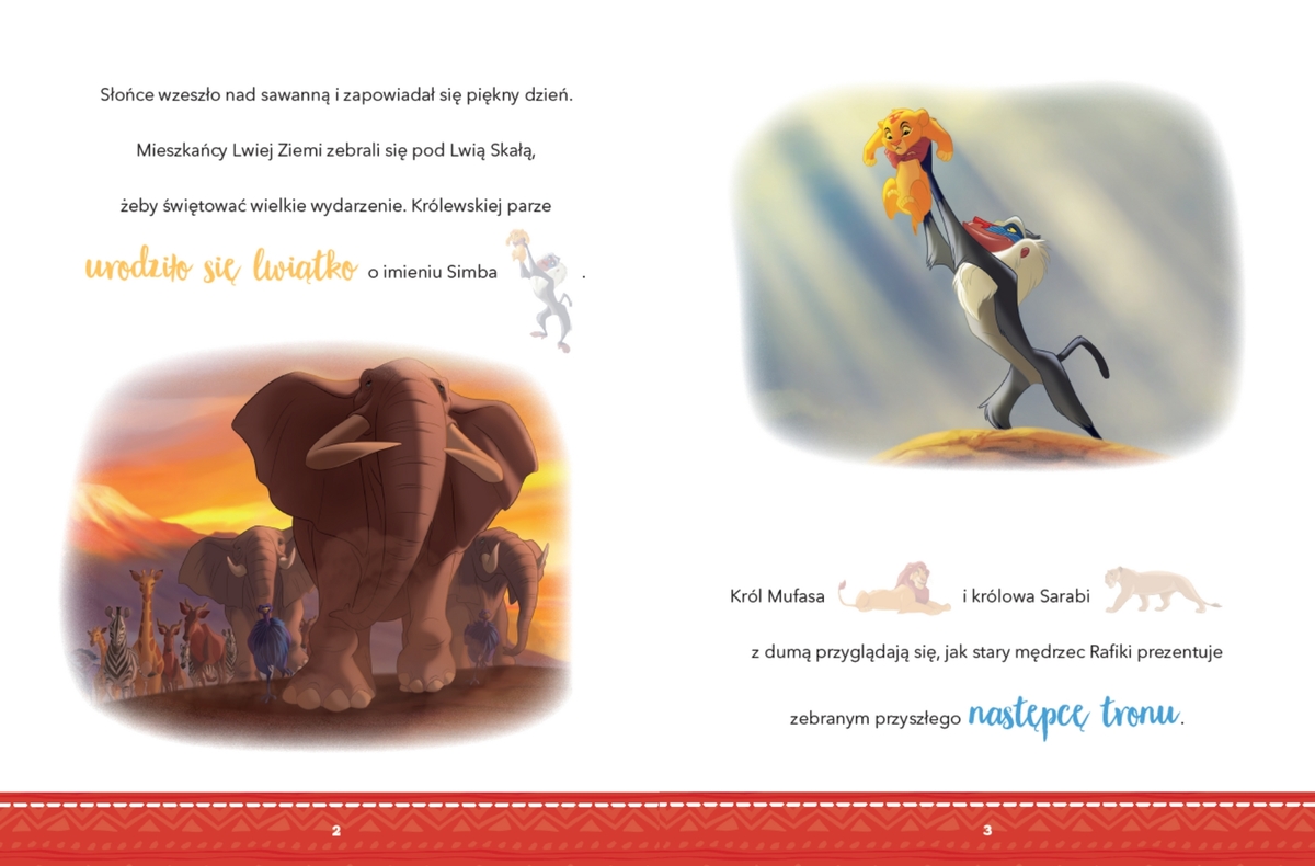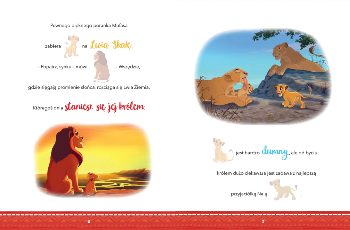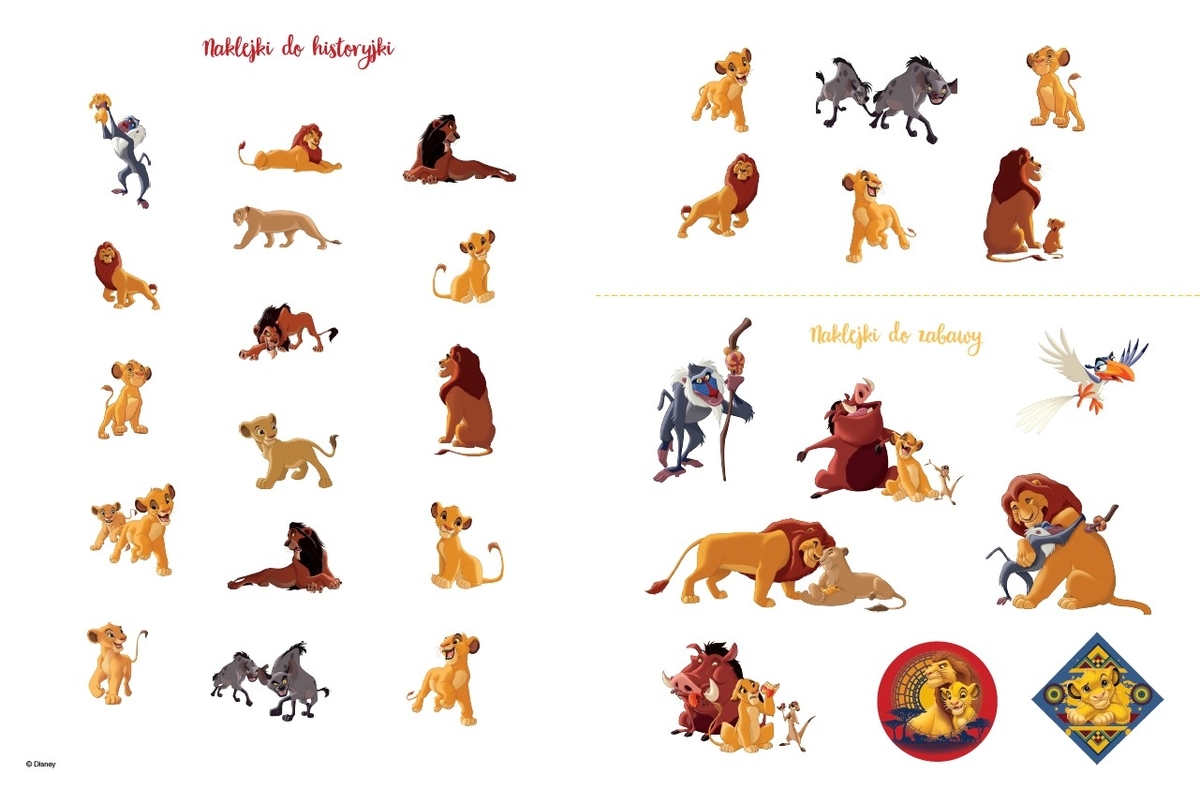 Bajecznie kolorowa opowiastka o Simbie z dodatkowymi naklejkami, które służą do uzupełnienia tekstu, to wspaniały prezent dla każdego dziecka. Poznawanie przygód ulubionych bohaterów z filmów Disneya i zabawa naklejkami nie tylko przegonią nudę, ale też pozwolą maluchom rozwinąć wyobraźnię, spostrzegawczość i koordynację ręka-oko.