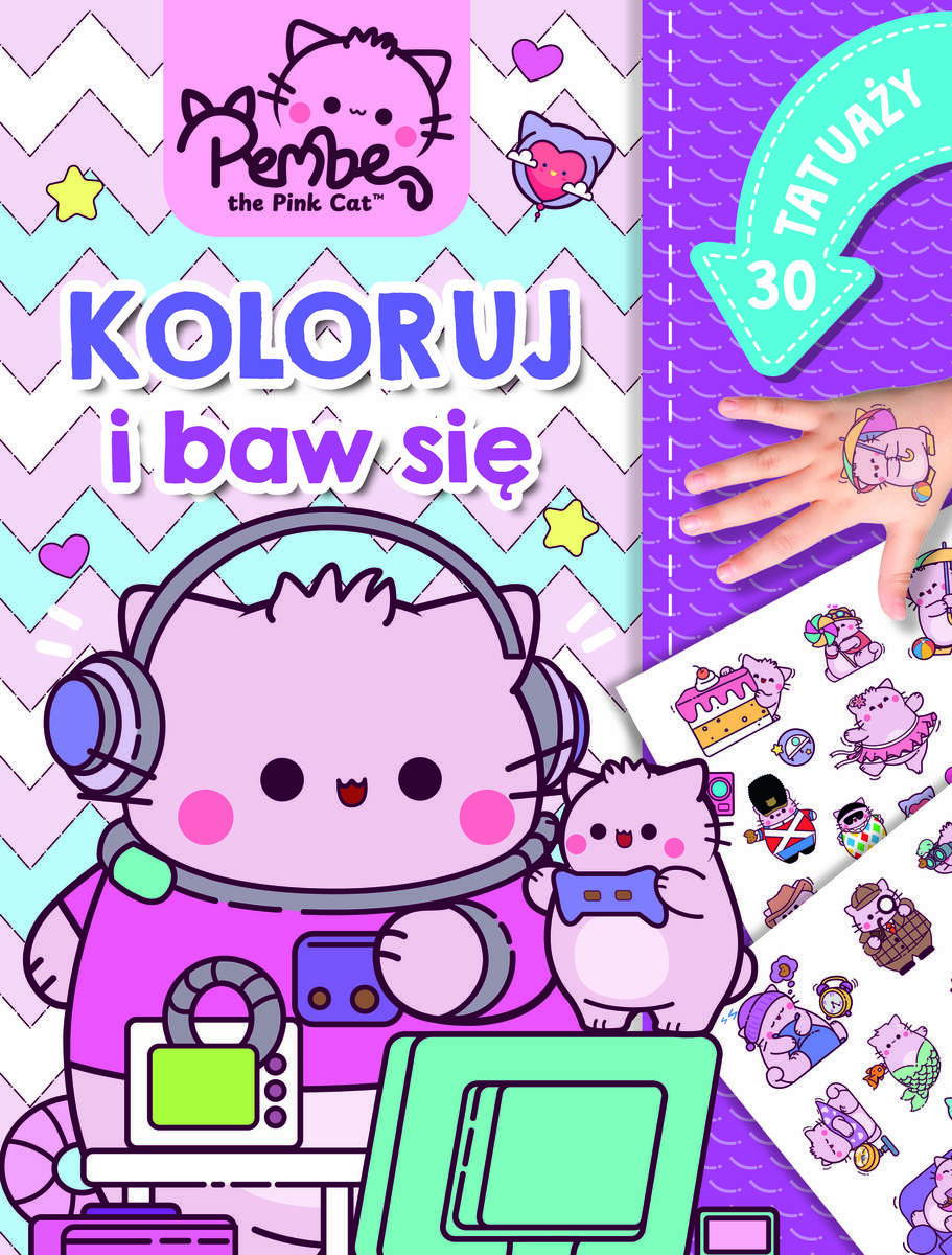 Książka z kociastymi tatuażami. Pembe The Pink Cat to kociak, którego nie sposób nie pokochać. Czerpie radość z życia, nawet wtedy gdy na zewnątrz pada albo śnieży. On wie, że wystarczy cieplutki kocyk i pyszna gorąca herbatka, by nawet najgorszy dzień zmienił się w coś milusińskiego. W tej książeczce, której głównymi bohaterami są Pembe oraz Little Pembe, znajdziesz różnorodne zadania i kolorowanki. Dodatkowo są do niej dołączone tatuaże z oboma kotami - kolorowe i pełne ciepłych emocji, tak samo jak Pembe.