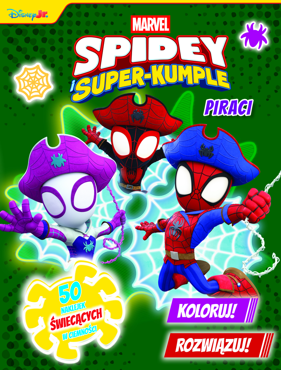 Ahoj, przygodo! Oto Pajęcza Drużyna na pirackim szlaku. Wejdź na pokład wraz ze Spidey’em i superkumplami, którzy tym razem wcielają się w dzielnych piratów. Czeka na ciebie dużo kolorowych zadań – wykreślanki, kolorowanki, zabawy rozwijające spostrzegawczość i kreatywność. Ale to nie wszystko! Do książki dołączone są naklejki świecące w ciemności – udekoruj nimi swoje zeszyty, pokój albo piracki skarb i zobacz, jak rozbłyskują w mroku! Ta książka to połączenie zabawy, nauki i niezwykłej przygody – idealna dla małych fanów Spidey’ego, którzy uwielbiają odkrywać nowe światy i marzą o pirackich eskapadach.