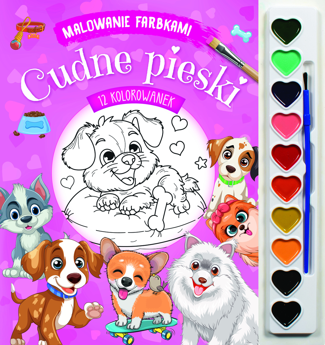 „Cudne pieski” to urocza książeczka do malowania farbkami, stworzona z myślą o małych miłośnikach zwierząt i twórczej zabawy. W środku czekają sympatyczne pieski gotowe, by nadać im kolory i wyrazy pyszczków według własnej wyobraźni. Malowanie rozwija kreatywność, precyzję i daje mnóstwo radości. To idealna propozycja na kolorowe popołudnie z pędzlem w dłoni!