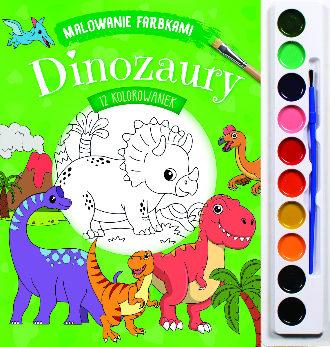 „Dinozaury” to kolorowanka z farbkami, która przenosi dzieci w fascynujący świat prehistorycznych stworzeń. W środku znajdziesz ulubione dinozaury – od groźnego tyranozaura po łagodnego stegozaura – gotowe do pomalowania według własnej wyobraźni. Malowanie farbkami rozwija zdolności manualne, kreatywność i dostarcza mnóstwo radości każdemu małemu artyście!