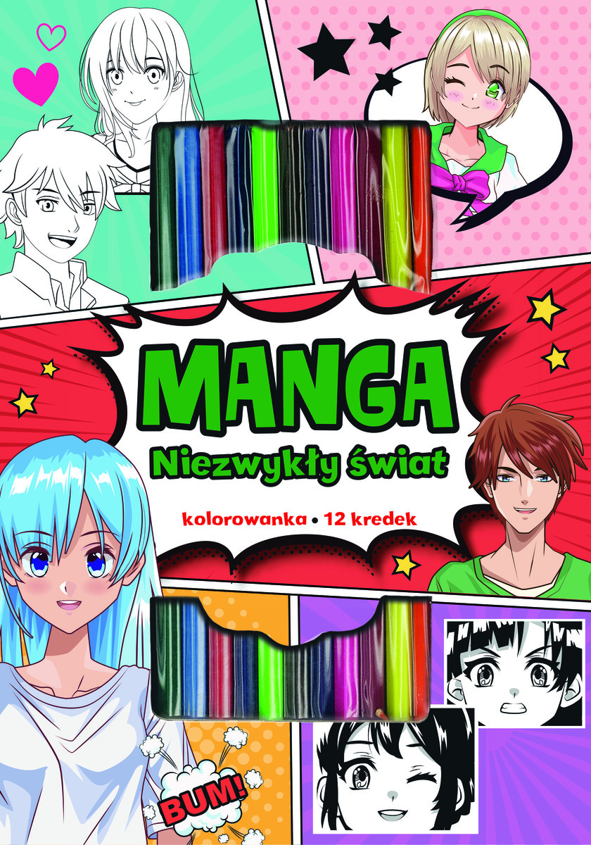 W zestawie znajdziesz 12 barwnych kredek oraz kolorowankę z czarno-białymi rysunkami w stylu manga. Koloruj, jak chcesz i kiedy chcesz. Na pewno powstaną wyjątkowe obrazki!
