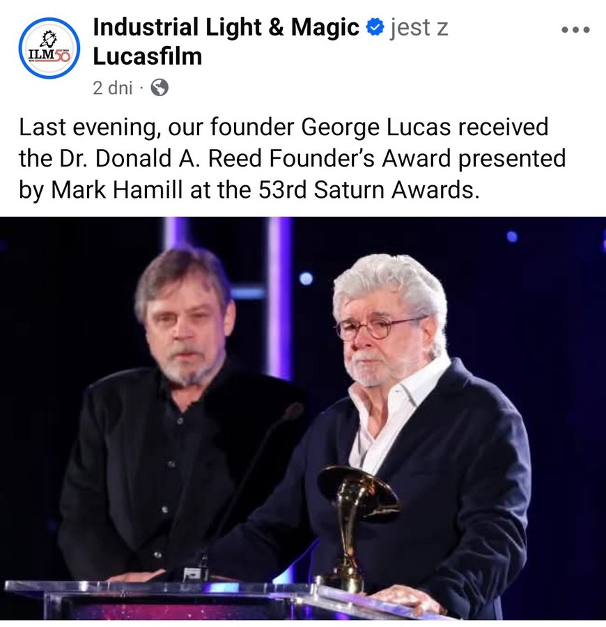 George Lucas i Mark Hamill podczas gali rozdania Saturnów, oficjalny profil Industrial Light & Magic, Facebook